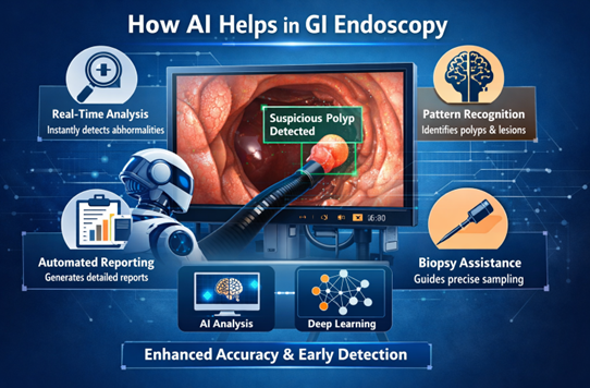 Artificial Intelligence (AI) has made significant advancements across various fields, revolutionizing healthcare with its potential to improve diagnoses and treatment outcomes. In gastroenterology, AI is particularly transforming gastrointestinal (GI) endoscopy by assisting with real-time analysis of endoscopic images, leading to earlier and more accurate detection of diseases, including cancer. AI algorithms are designed to recognize patterns and abnormalities that the human eye may miss, offering a new level of precision in GI endoscopy.